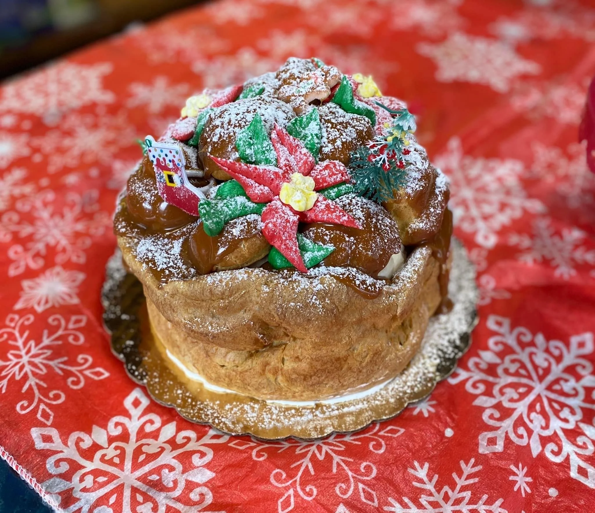 LARGE CREAM PUFF TOPPED WITH MINI CREAM PUFFS AND CARAMEL